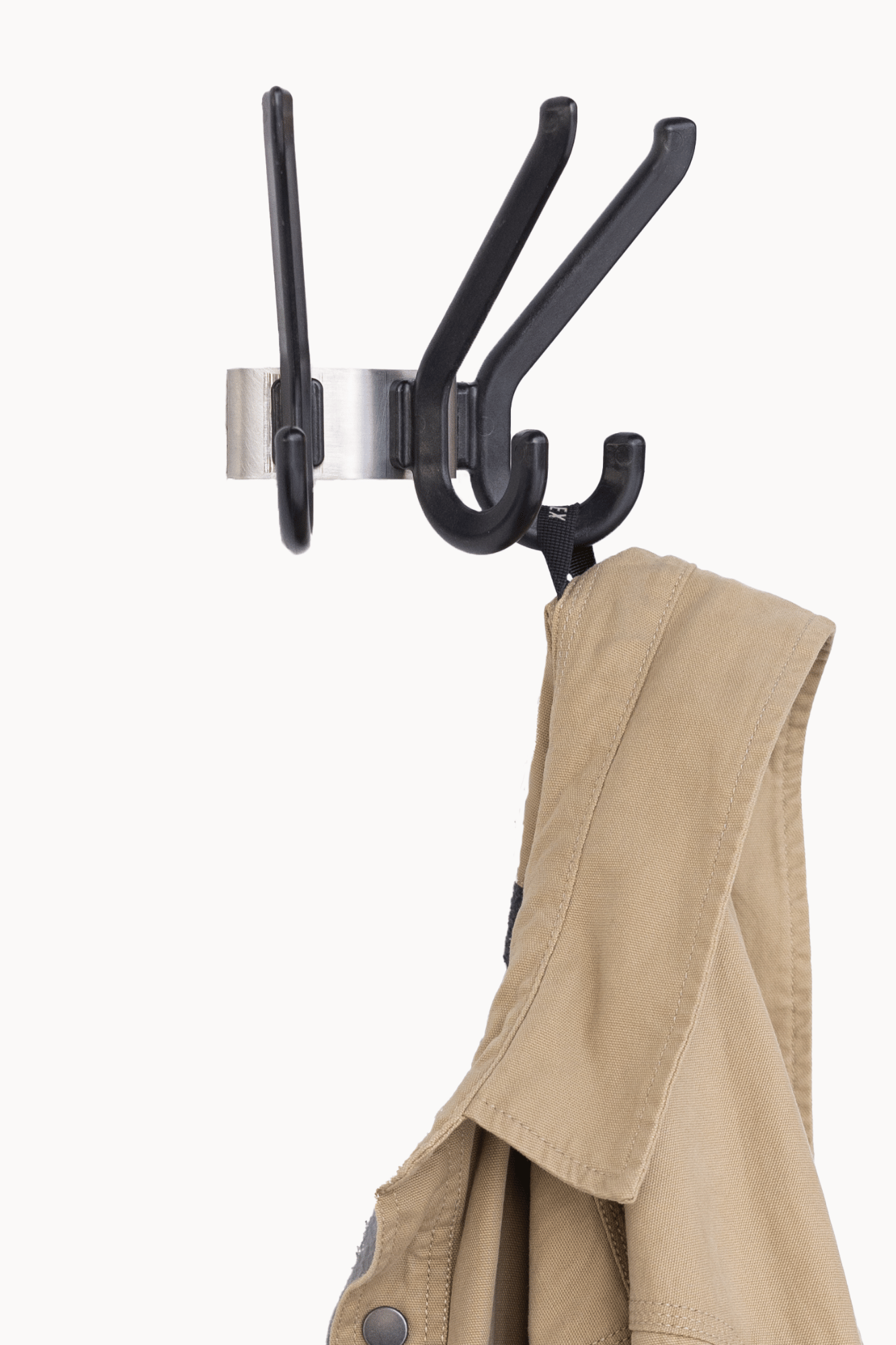 Solidt tøjophæng med 3 kroge fremstillet i børstet rustfrit stål og med plastpind af genbrugsplast tilsat 30% glasfiber. Stor krog med plads til meget tøj mm. Kan hænge både ude og inde