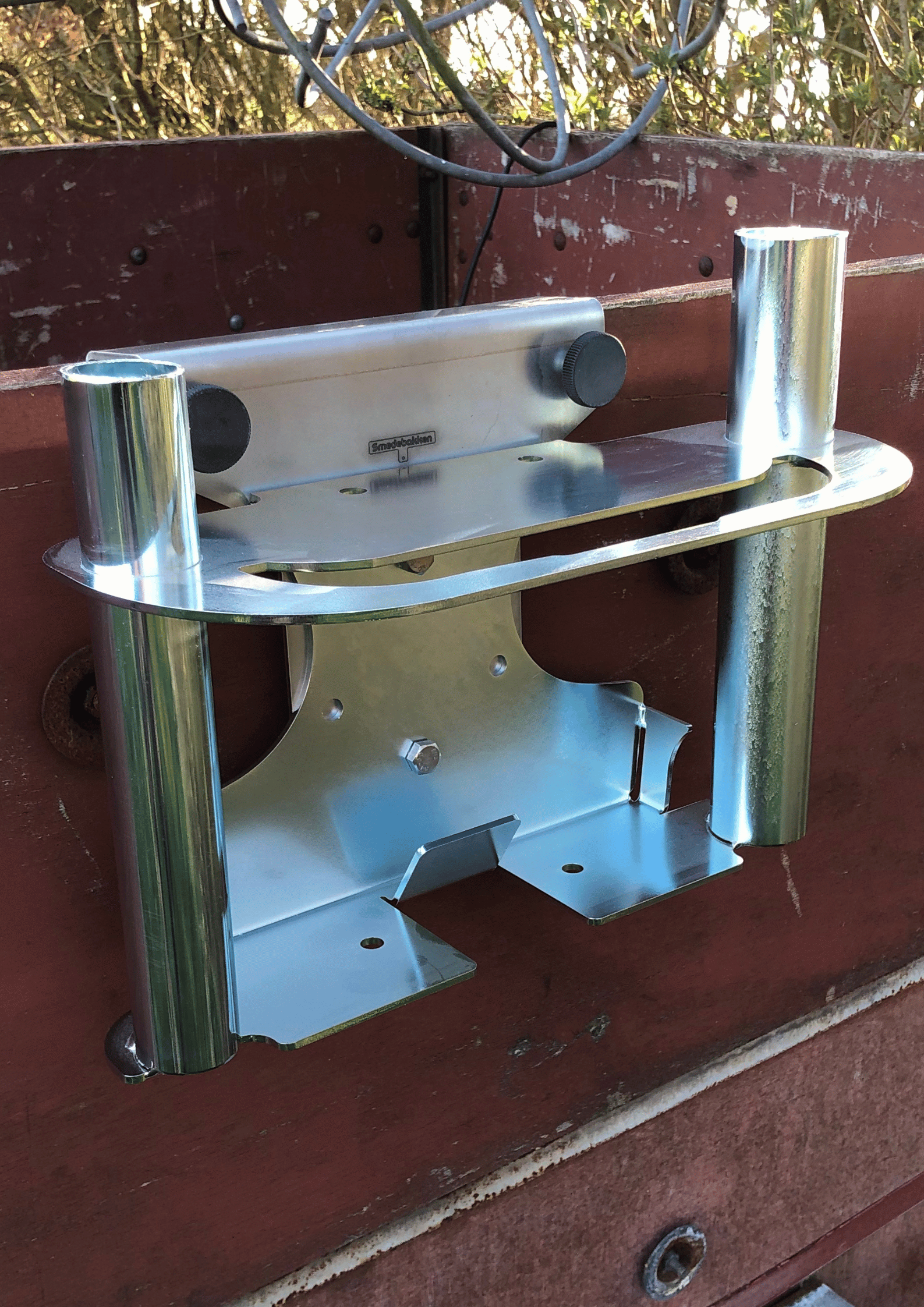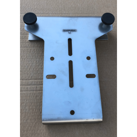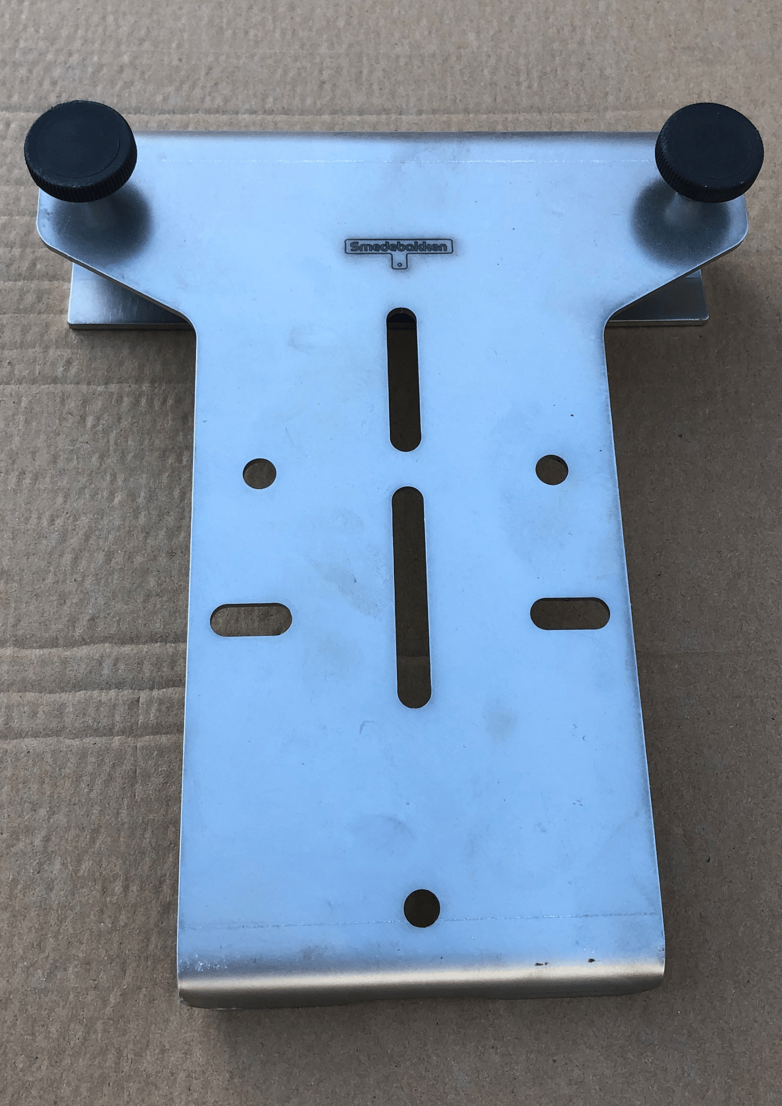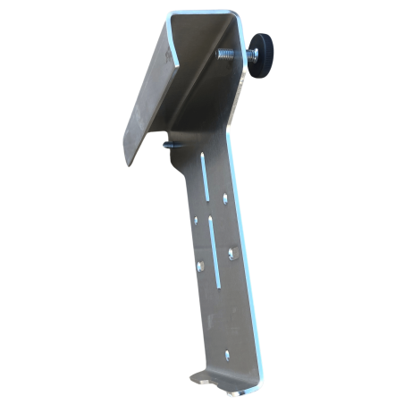 Universal hægtebeslag fremstillet i børstet rustfrit stål for Smedebakkens forskellige redskabsbærere til hurtig montering på vognside eller lignende steder. Beslaget kan gå ned over ca. 42mm brede sider/vanger mm.