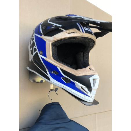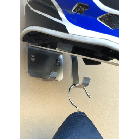 Solid styrthjelmsophæng til Full face hjelme fremstillet i børstet rustfrit stål. Velegnet til udstilling og ligeledes almindelig opbevaring i garage og værksteder mm. Beslaget er fremstillet med 2 kraftige kroge der gør det muligt, at hænge tøj og udstyr op under, enten på bøjler eller bare på krogene.