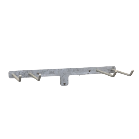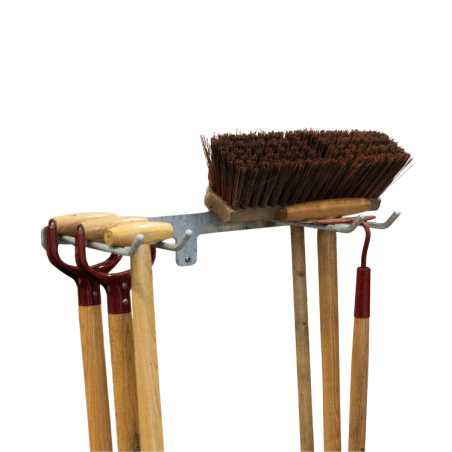 Praktisk dobbelt ophæng til 8 redskaber. På grund af den store afstand imellem krogene er der plads til at både koste, river og andre haveredskaber Det er et solidt ophæng, der er lavet i et kraftigt og slidstærkt materiale.