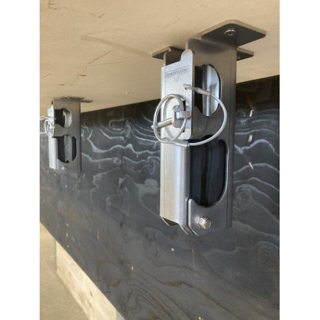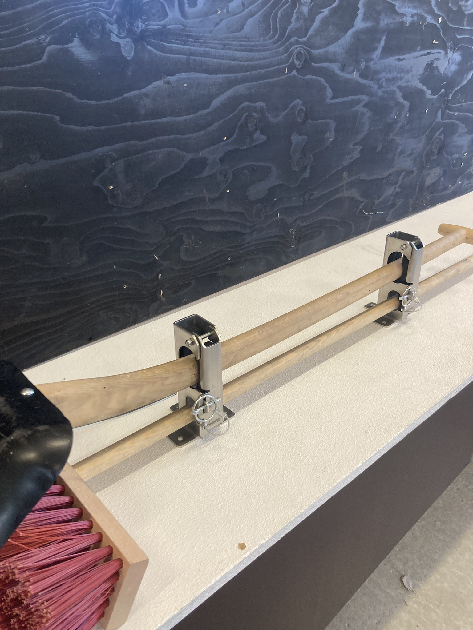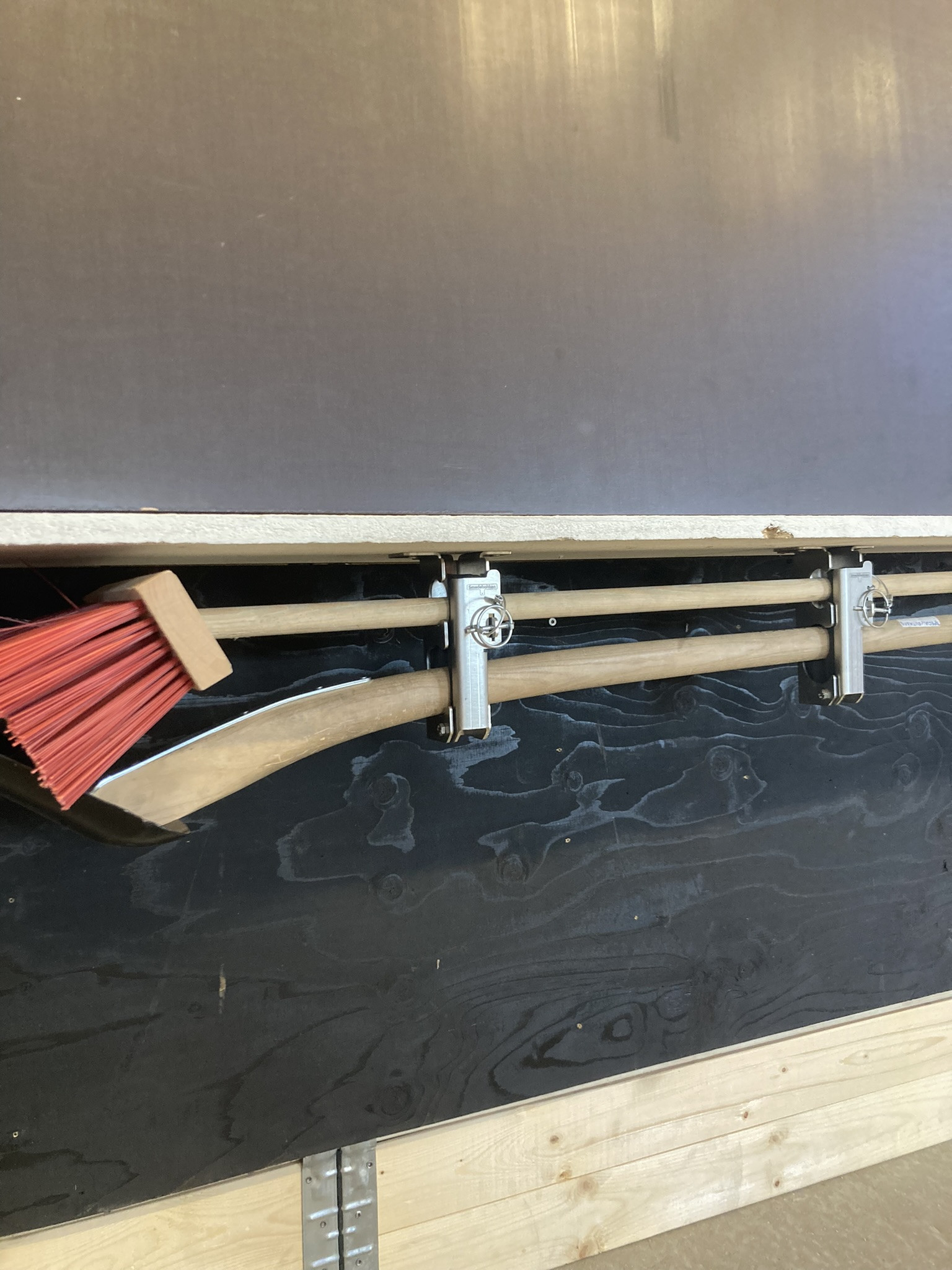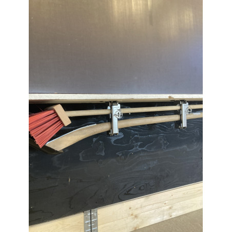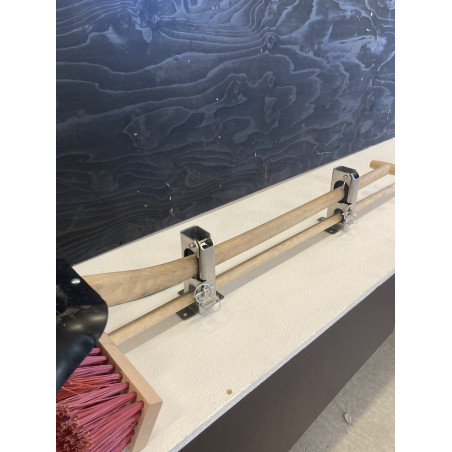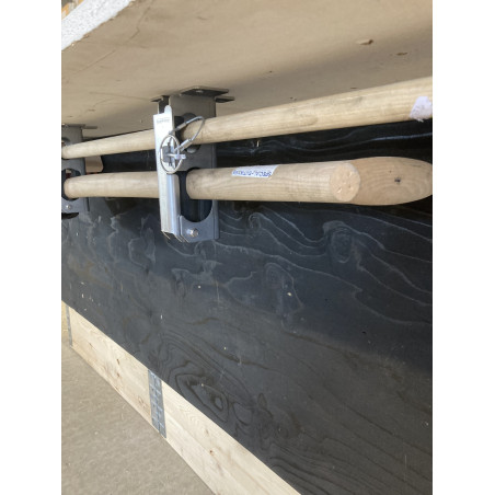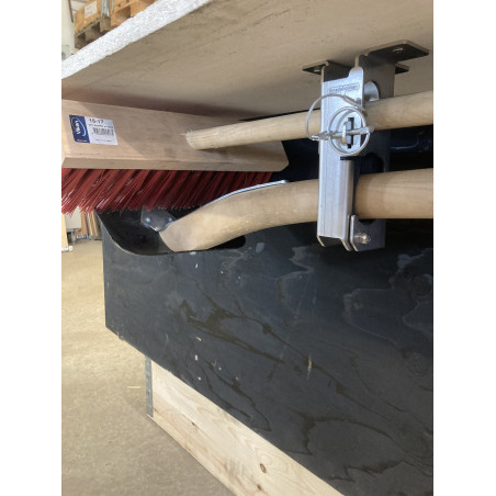 Smart redskabsklemme sæt til lodret/hængende montering med plads til 2 redskaber. Velegnet til en kost og skovl. - Tynd skaft i den ene hylde og tyk skaft i den anden større hylde. Kan f.eks. monteres op under vognlad/ladbiler og ligeledes stående lodret oven på dæk og skærme mm. Redskaberne lægges let ind på sin hylde og fastlåses sikkert og lydløst når klappen lukkes inden kørsel.