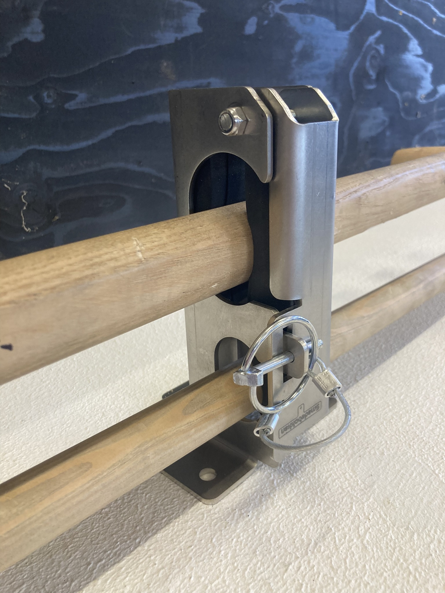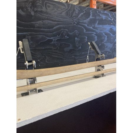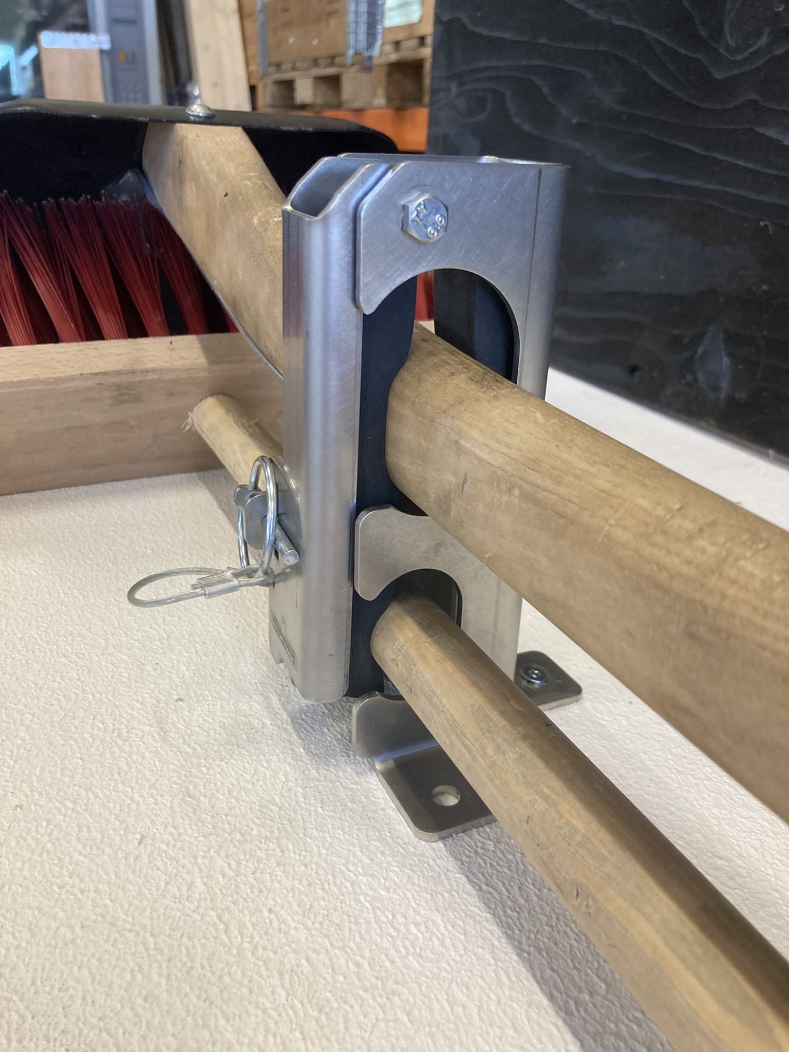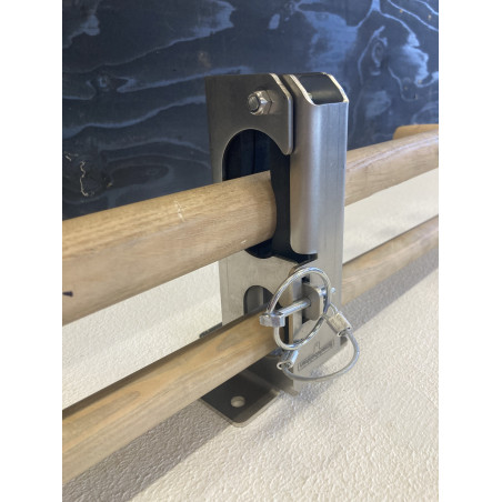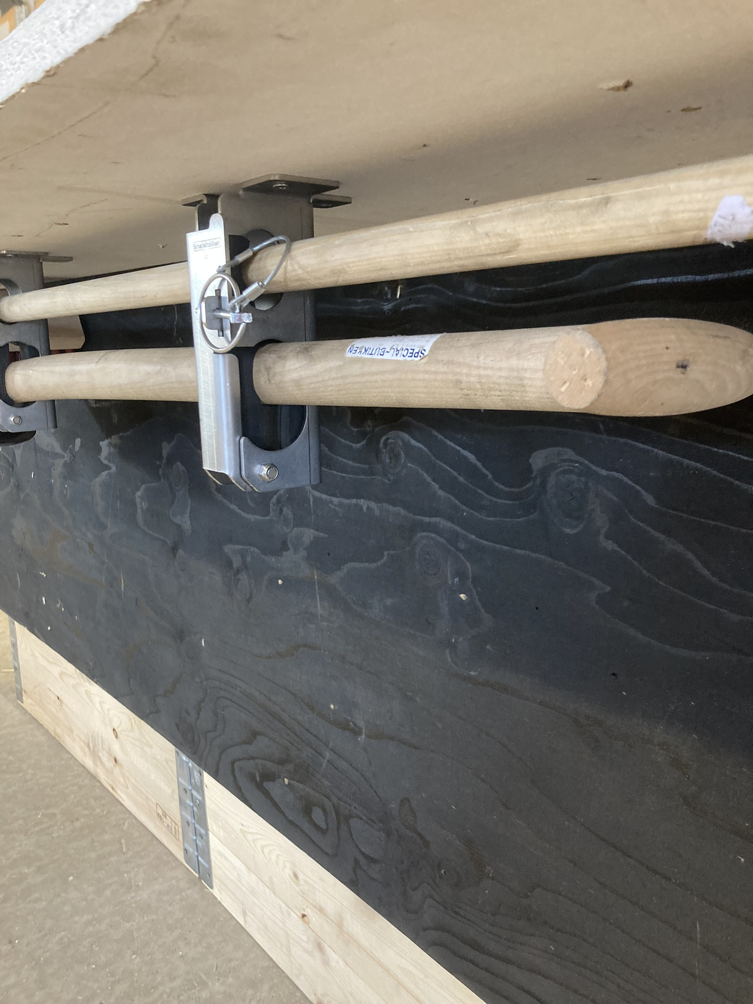 Smart redskabsklemme sæt til lodret/hængende montering med plads til 2 redskaber. Velegnet til en kost og skovl. - Tynd skaft i den ene hylde og tyk skaft i den anden større hylde. Kan f.eks. monteres op under vognlad/ladbiler og ligeledes stående lodret oven på dæk og skærme mm. Redskaberne lægges let ind på sin hylde og fastlåses sikkert og lydløst når klappen lukkes inden kørsel.