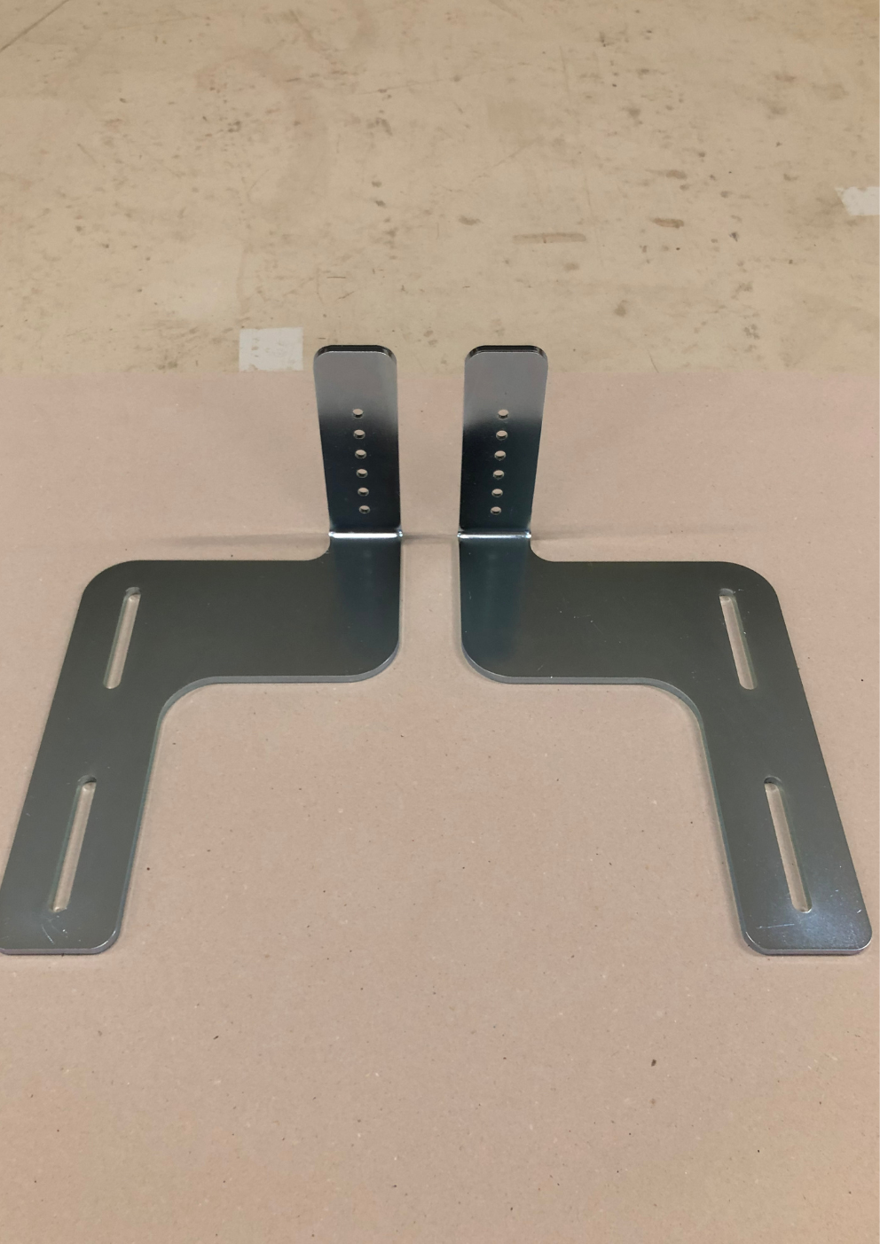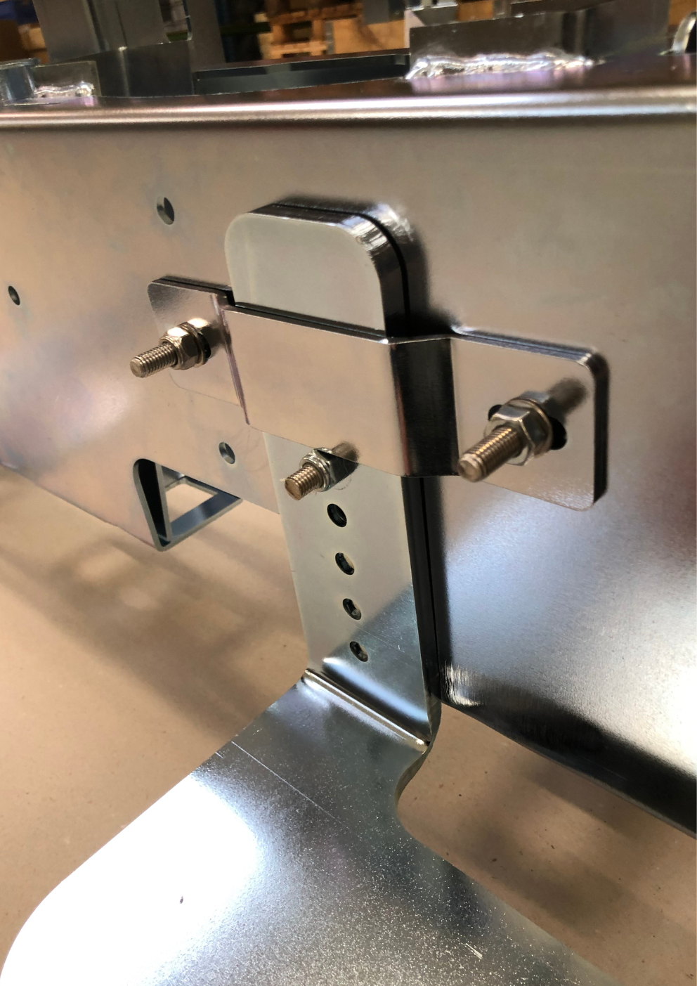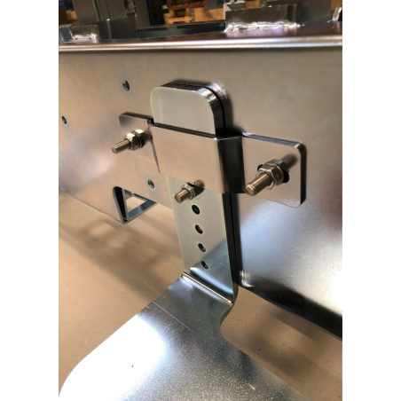 Komplet kraftigt monteringssæt til bl.a. Vogele asfaltmaskine. (Fremstillet til vare nr. 1891 + 1907) Sættet består af 2 beslag til montering på vanger samt 2 stk. ubøjlebeslag til redskabsbæreren. Rustfrit boltesæt medfølger til ubøjlerne samt højdejustering.