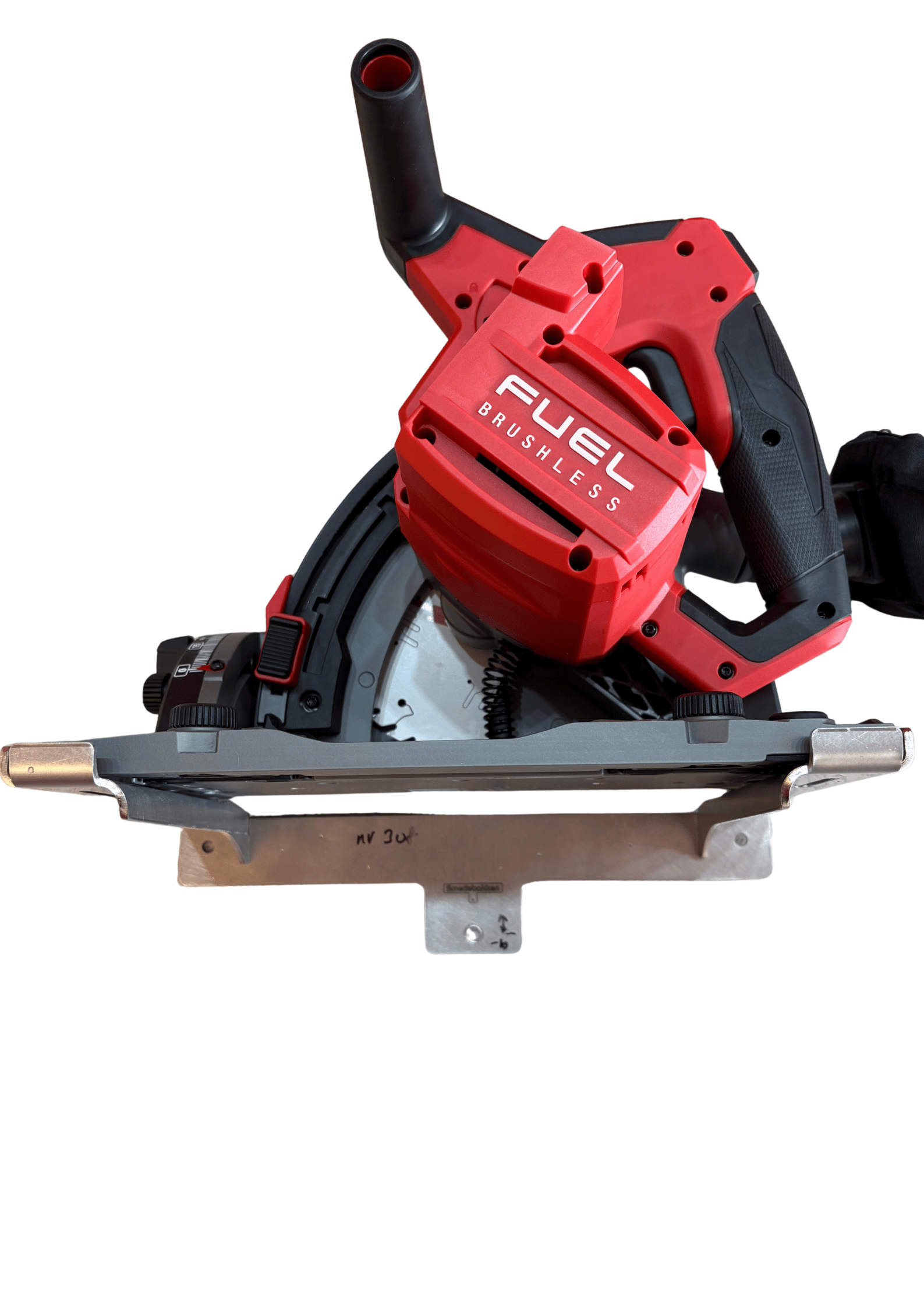 Ophæng fremstillet i børstet rustfrit stål til dyksav og almindelig rundsav. Holderen er universal og passer således og til rundsave hvor klingen går nedenunder mellem vangerne på beslaget.